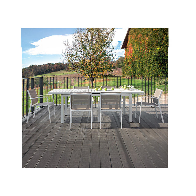 A szerkezet porszórt alumíniumból készült, amely ellenáll az időjárási viszonyoknak, és hosszú távú tartósságot biztosít. A bővíthető asztallap segítségével gyorsan és egyszerűen igazíthatod az asztal méretét a vendégek számához – ideális mindennapi használatra vagy különleges alkalmakra.