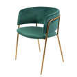 A Mia szék zöld kárpitozása különleges megjelenést kölcsönöz, míg a bronz-arany színű fémváz modern és kifinomult stílust sugároz.