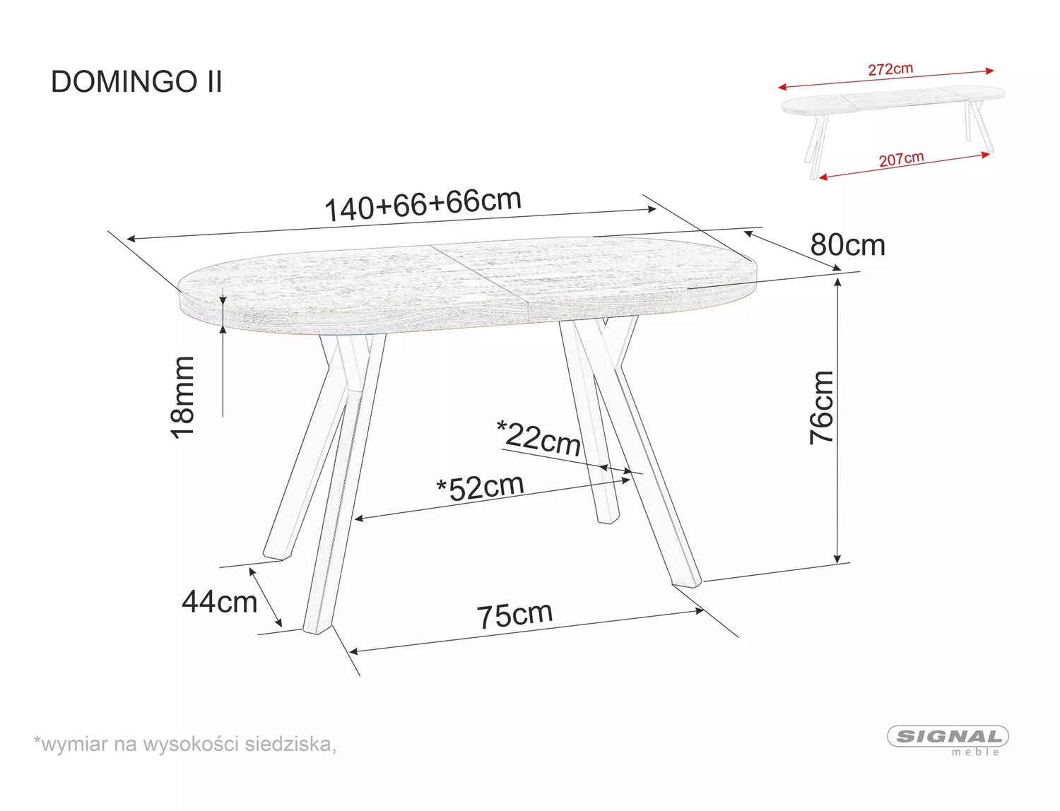 Méretek: 140–180 × 80 × 75 cm, bővíthető 180 cm-ig.