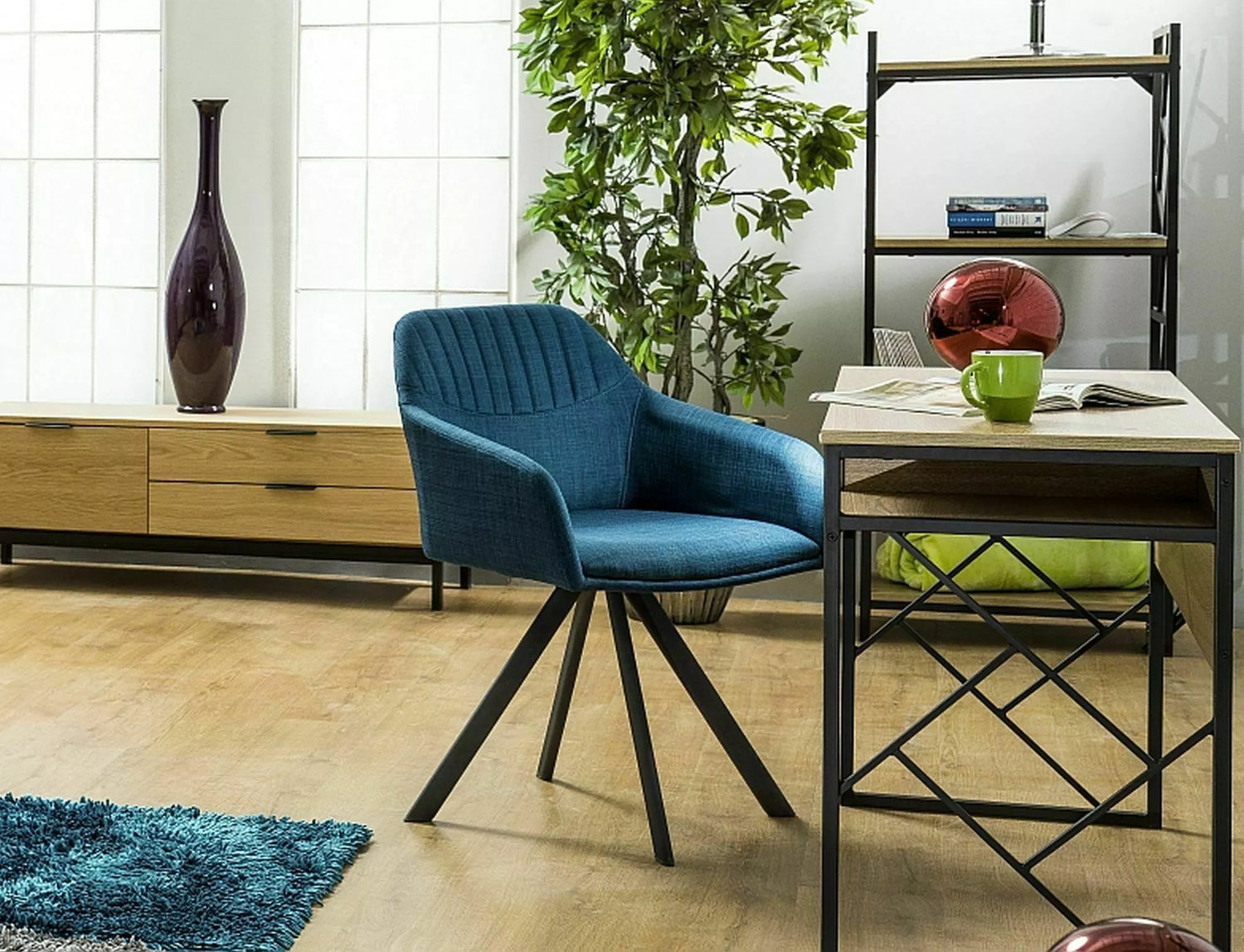 Praktikus, fiókos íróasztal kompakt méretben. Két fiókja és nyitott rekeszei rendezett munkafelületet tesznek lehetővé.